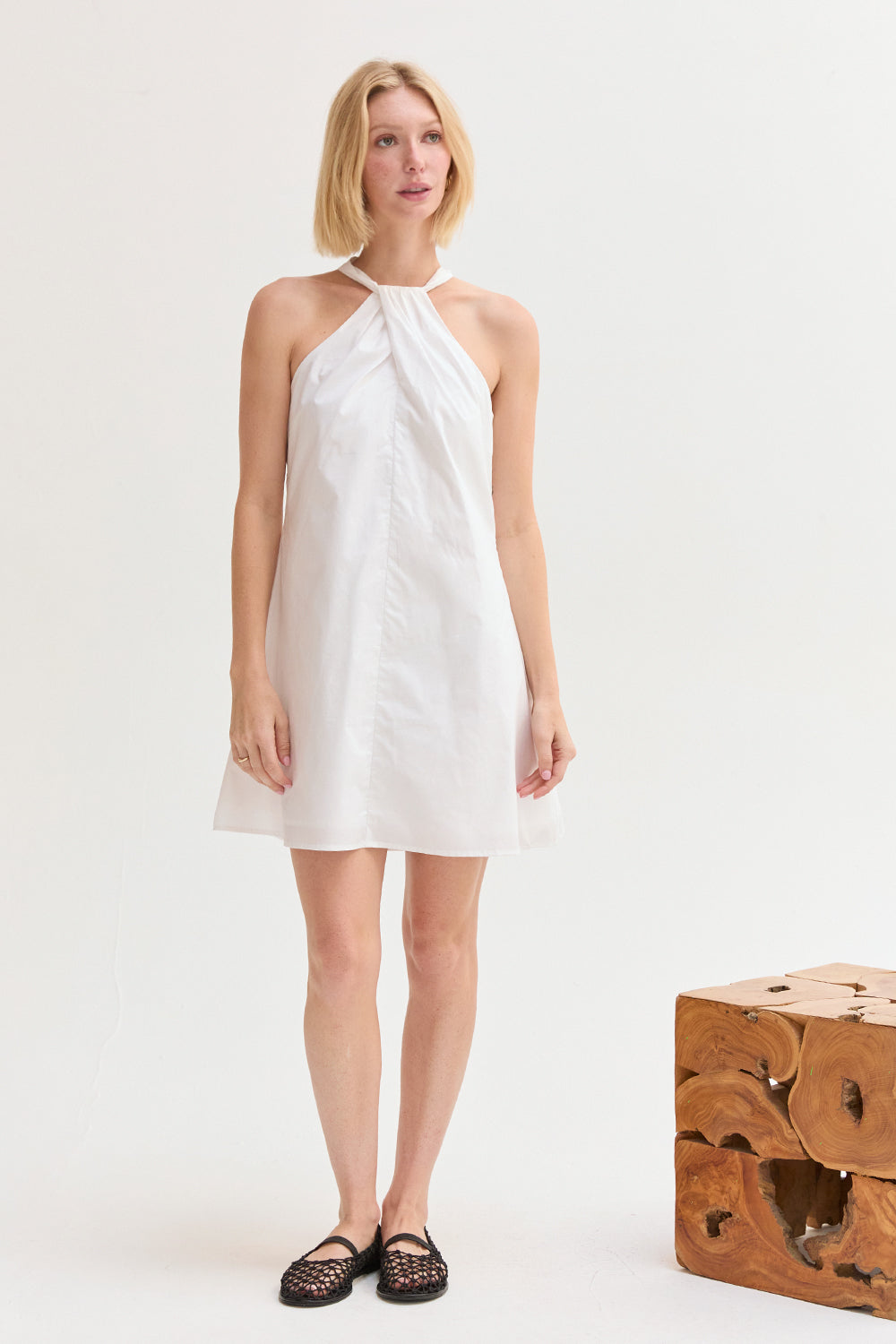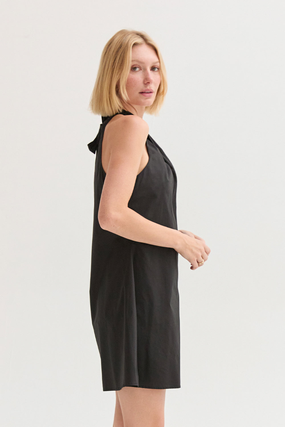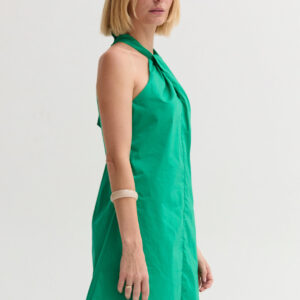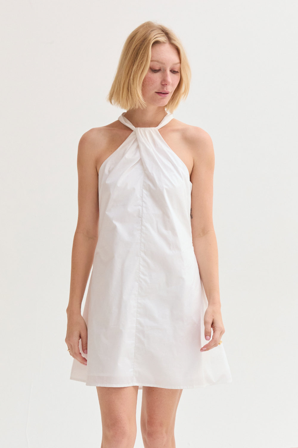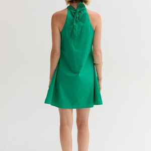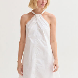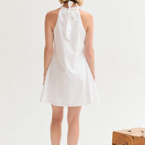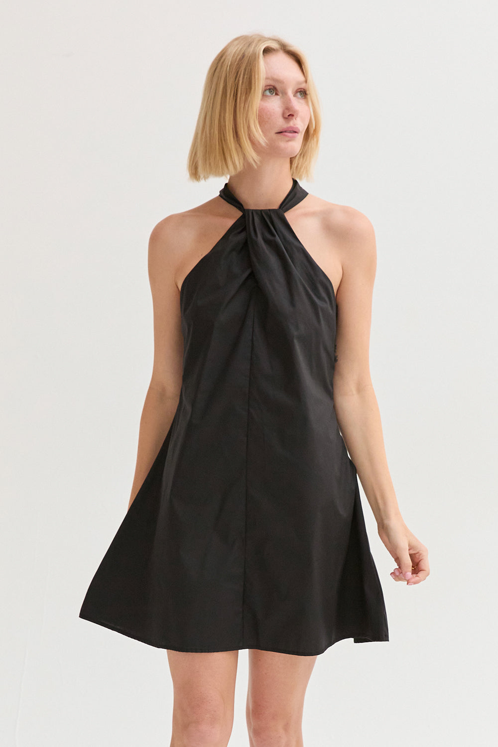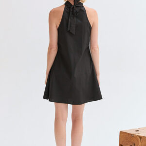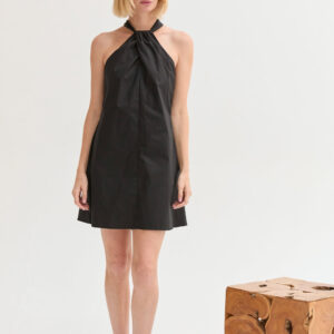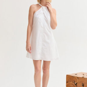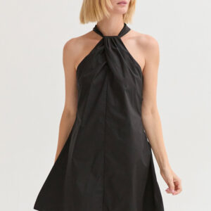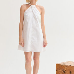 The Chloe Halter Poplin Mini Dress features a halter neckline with a self-tie and front pleat detail. Designed in a fit-and-flare silhouette with a back keyhole and side zipper, it’s fully lined for an easy, comfortable fit.
