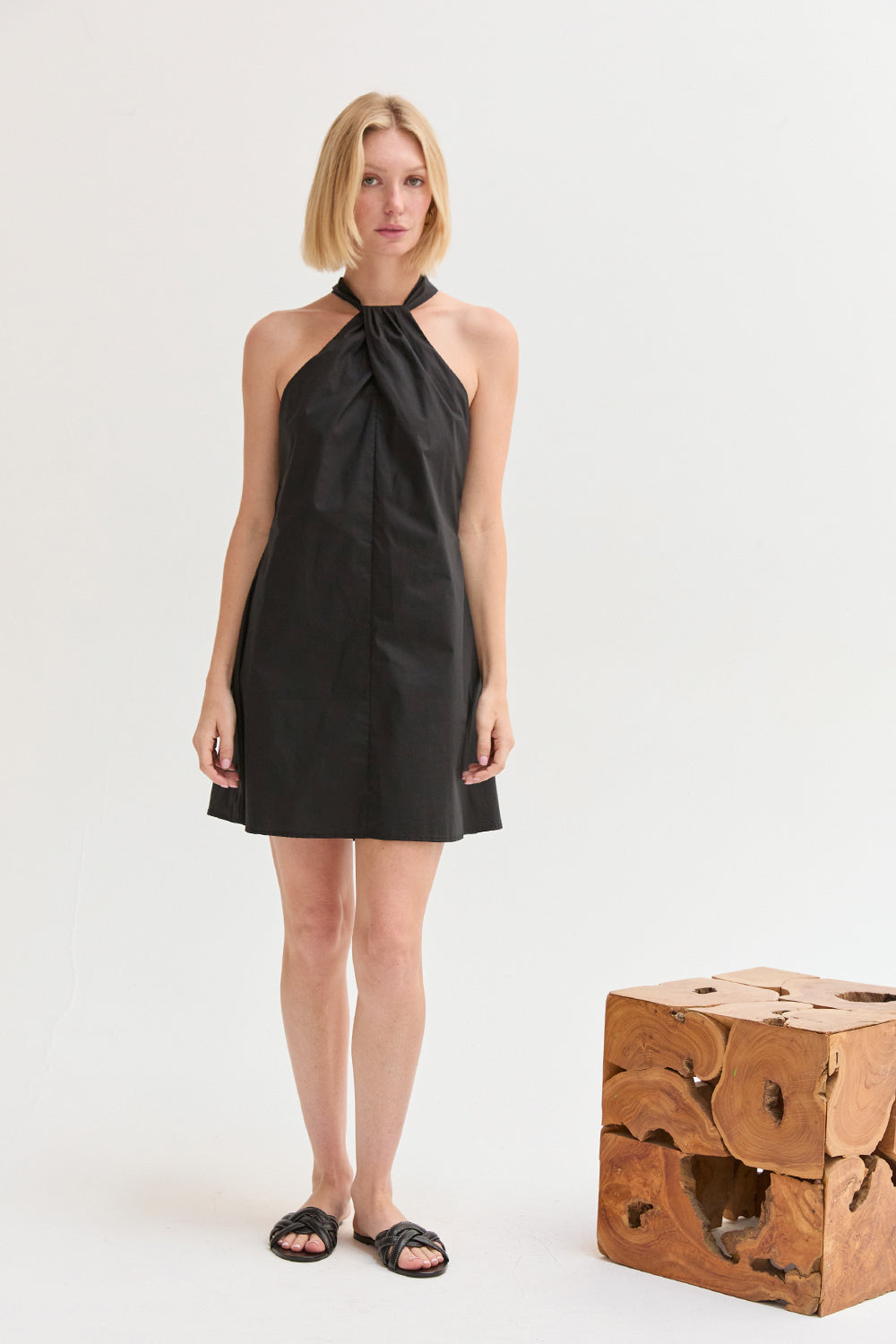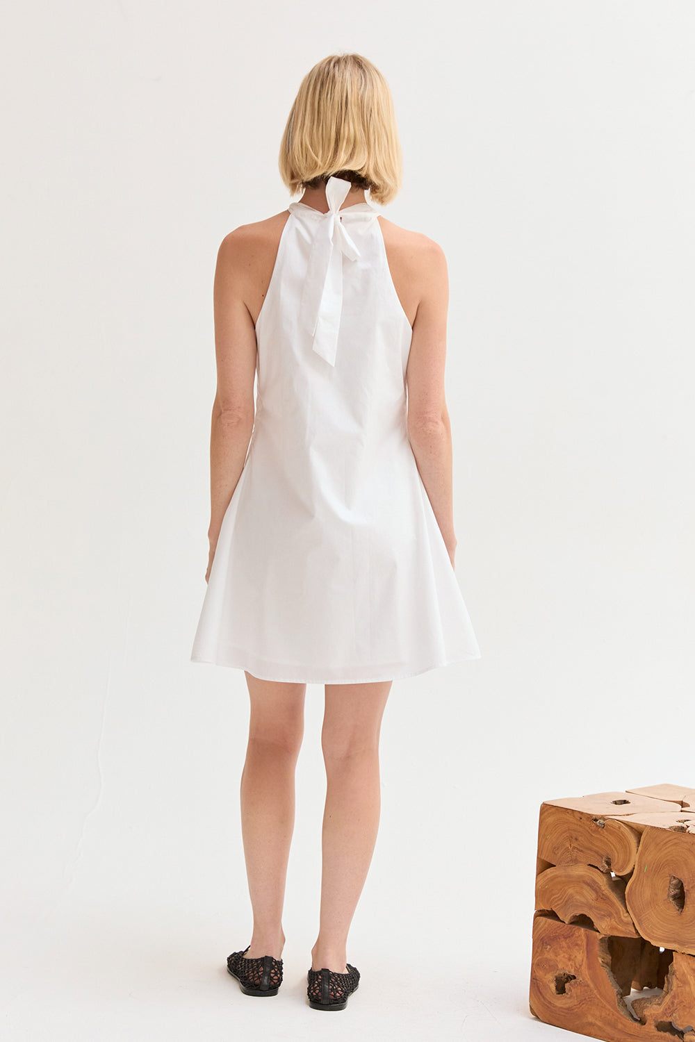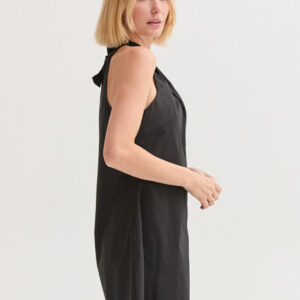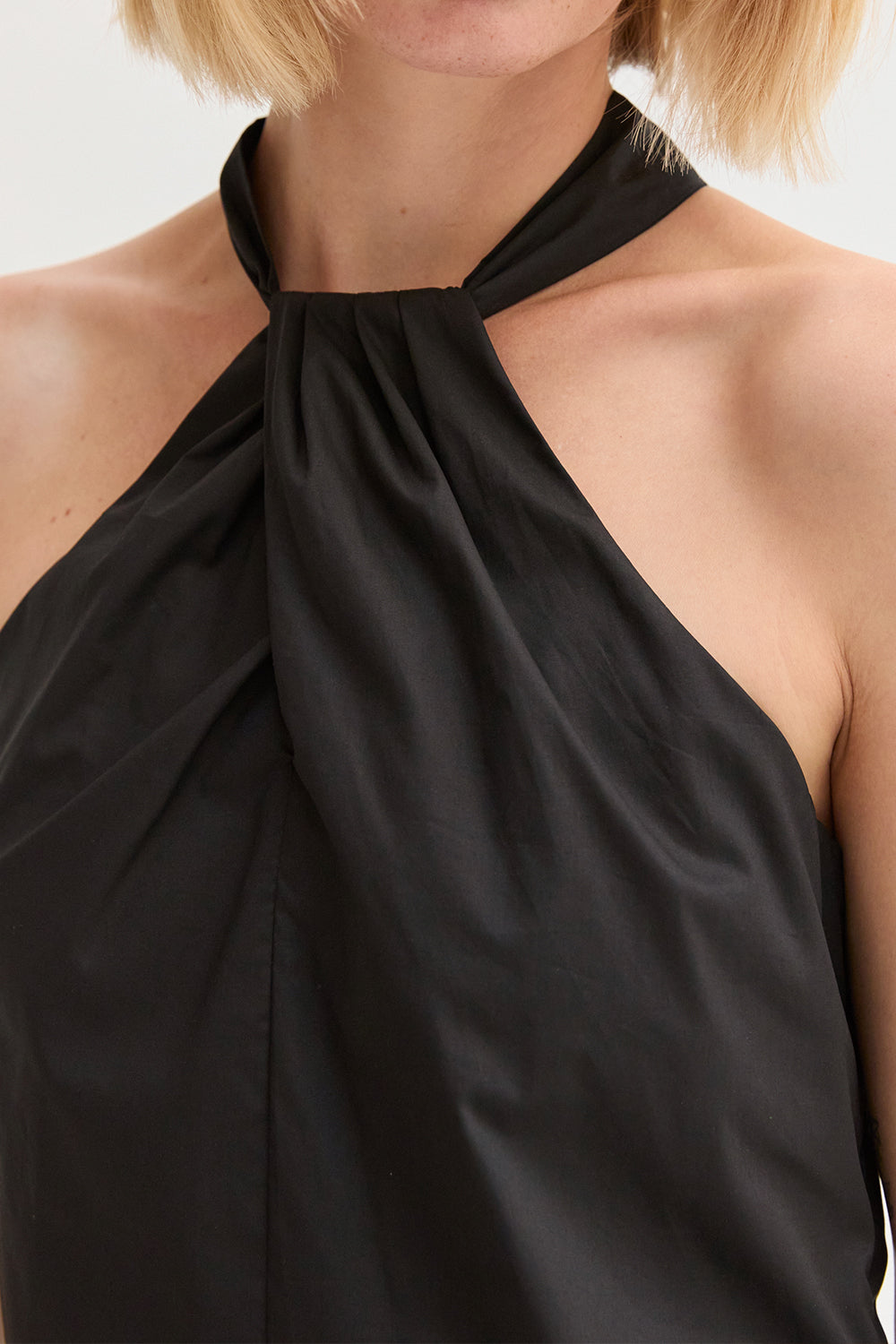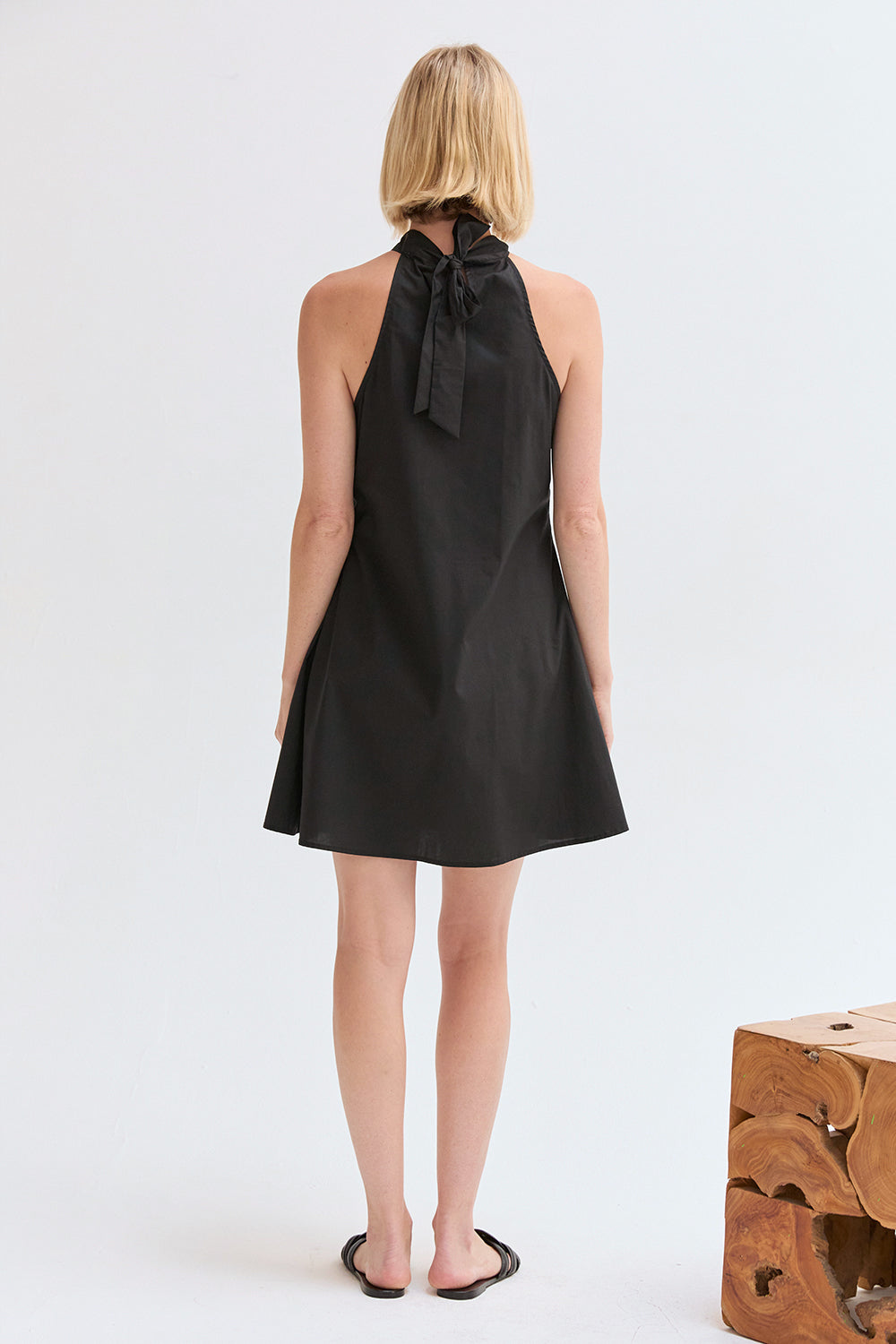 The Chloe Halter Poplin Mini Dress features a halter neckline with a self-tie and front pleat detail. Designed in a fit-and-flare silhouette with a back keyhole and side zipper, it’s fully lined for an easy, comfortable fit.