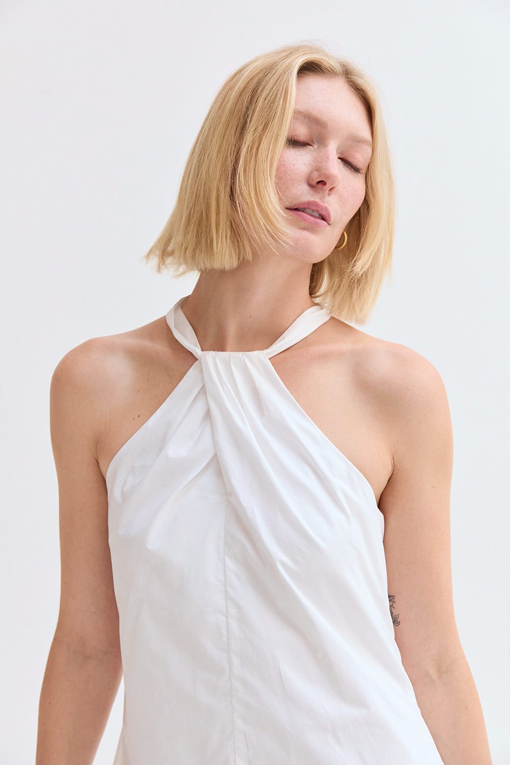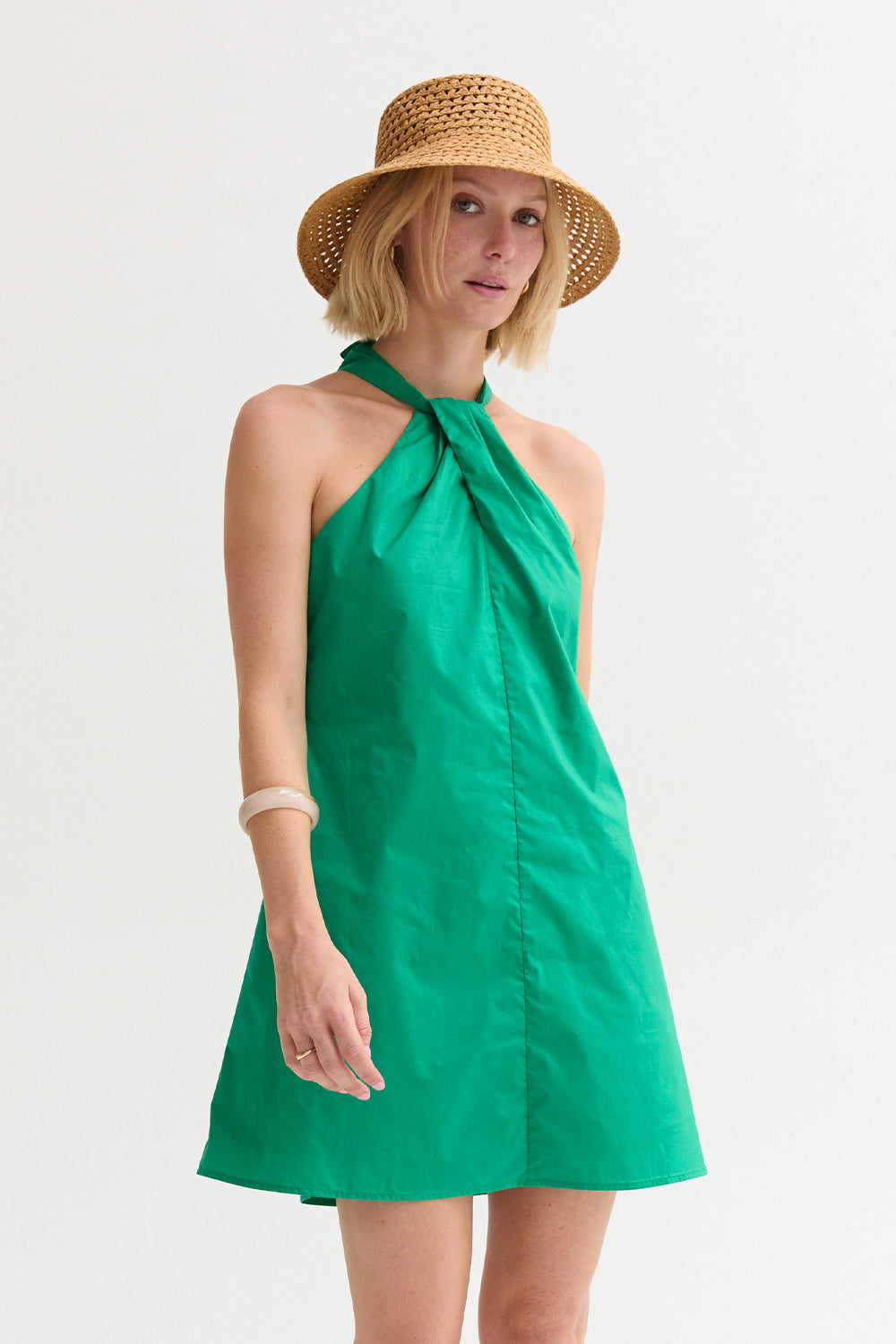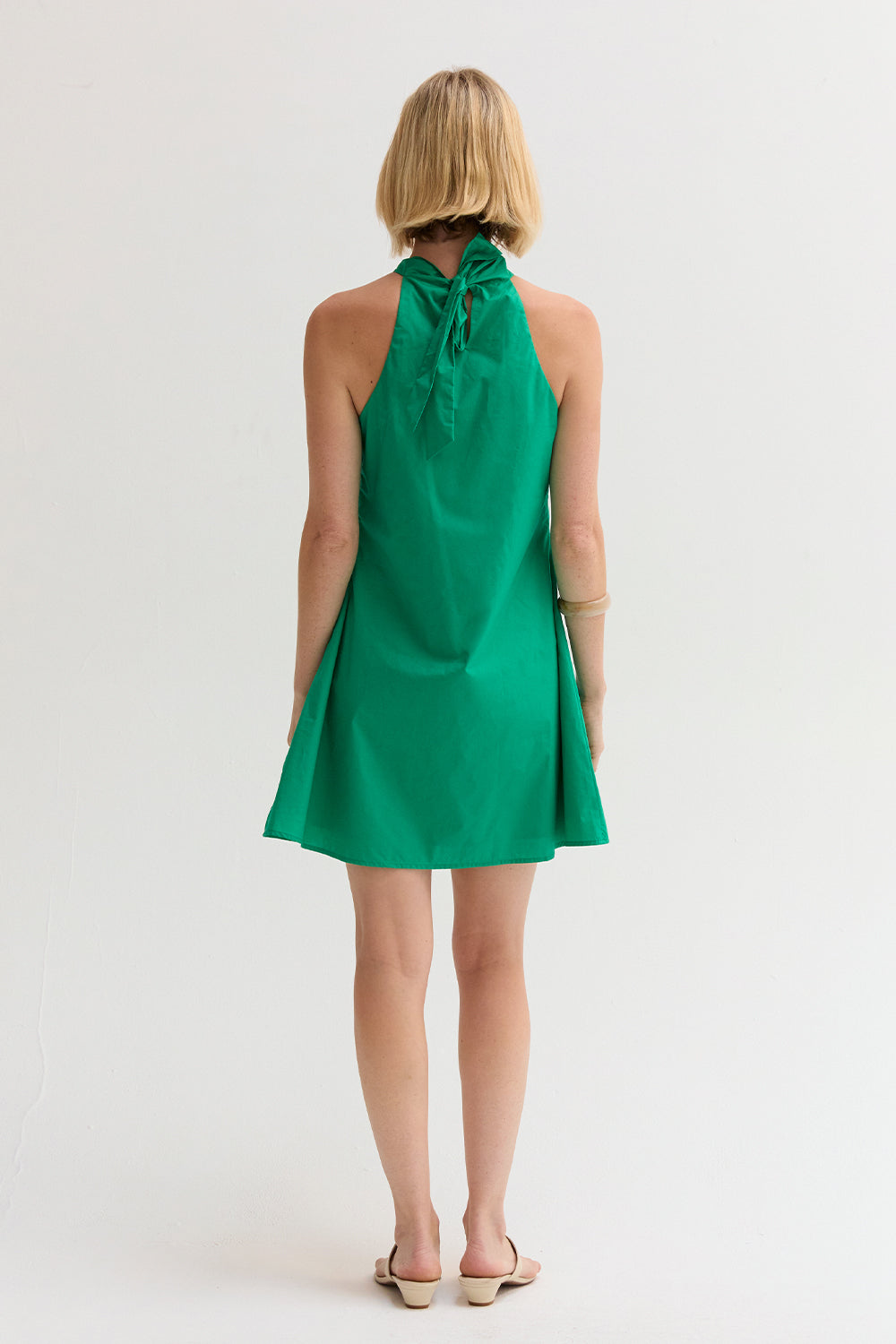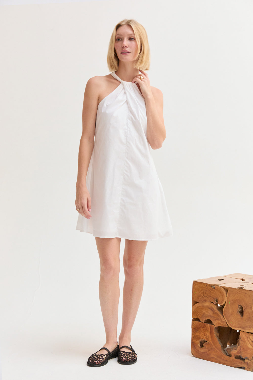 The Chloe Halter Poplin Mini Dress features a halter neckline with a self-tie and front pleat detail. Designed in a fit-and-flare silhouette with a back keyhole and side zipper, it’s fully lined for an easy, comfortable fit.