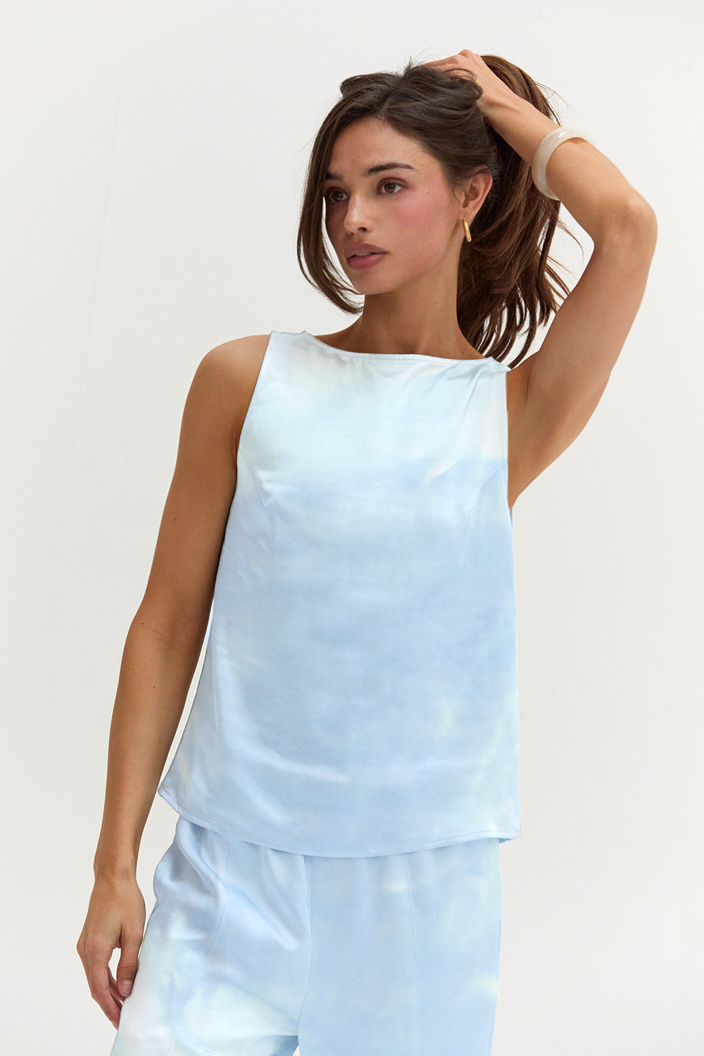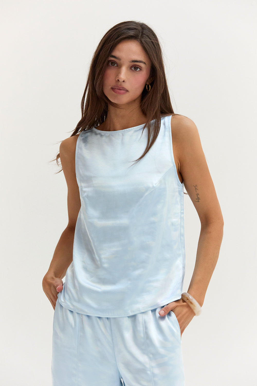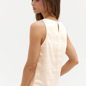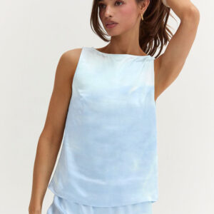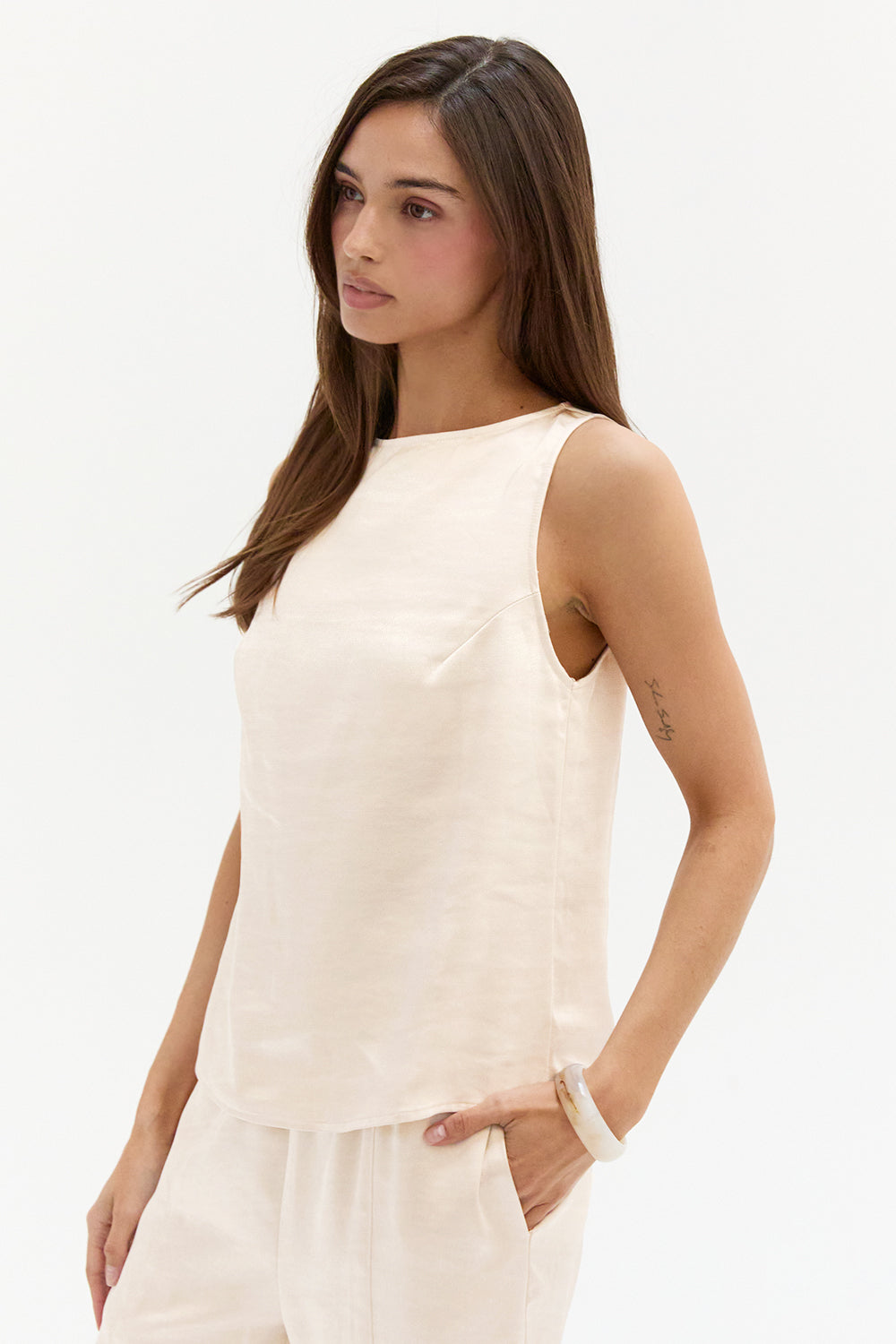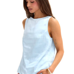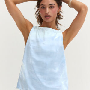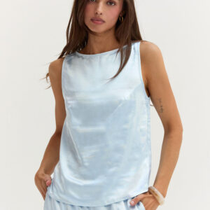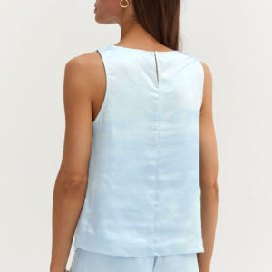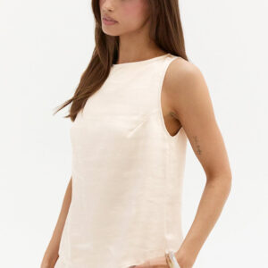 The Dawn Satin Sleeveless Top features a clean boat neckline and sleeveless silhouette in a smooth satin finish. Designed with subtle bust darts and a back keyhole, it offers a relaxed, easy fit.