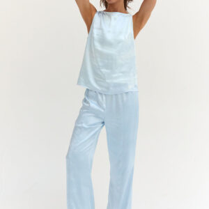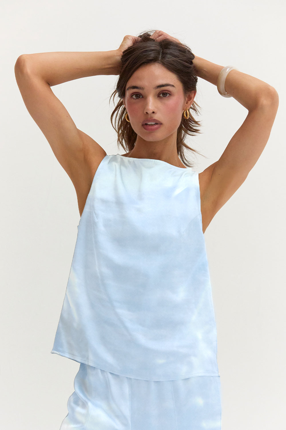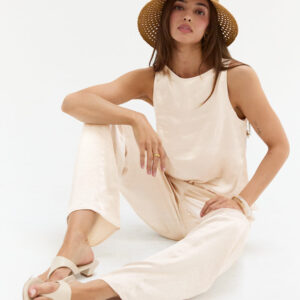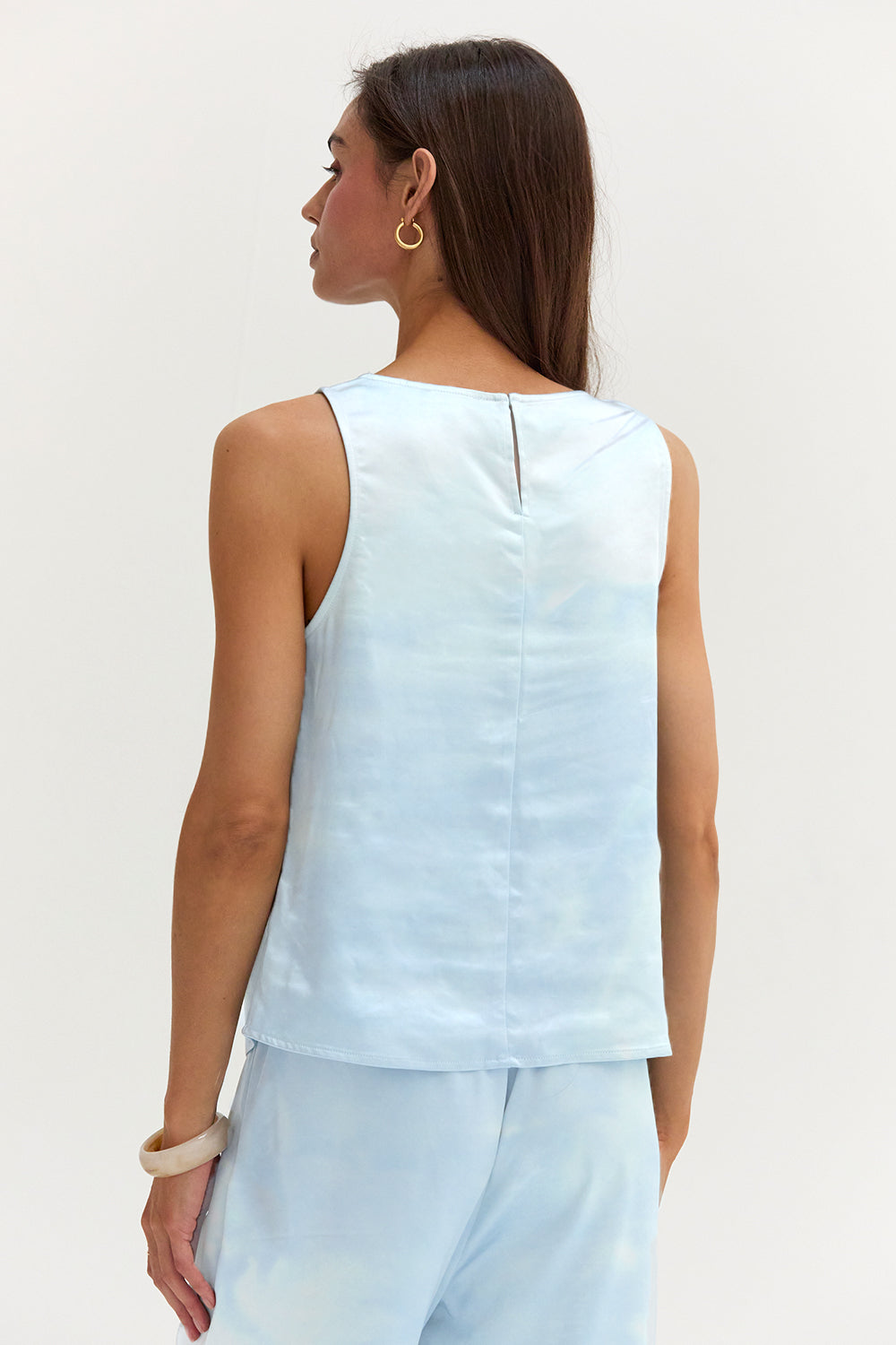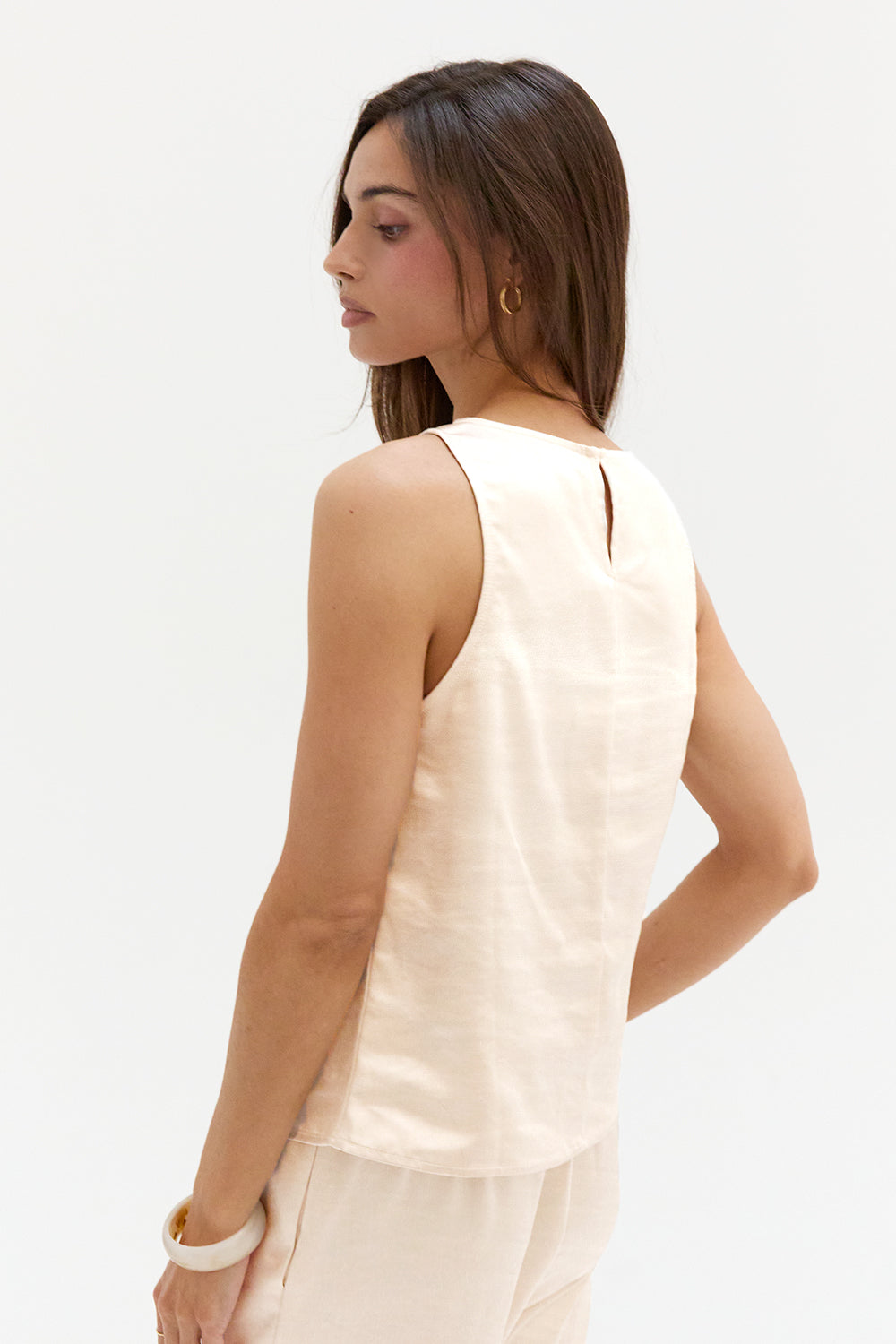The Dawn Satin Sleeveless Top features a clean boat neckline and sleeveless silhouette in a smooth satin finish. Designed with subtle bust darts and a back keyhole, it offers a relaxed, easy fit.