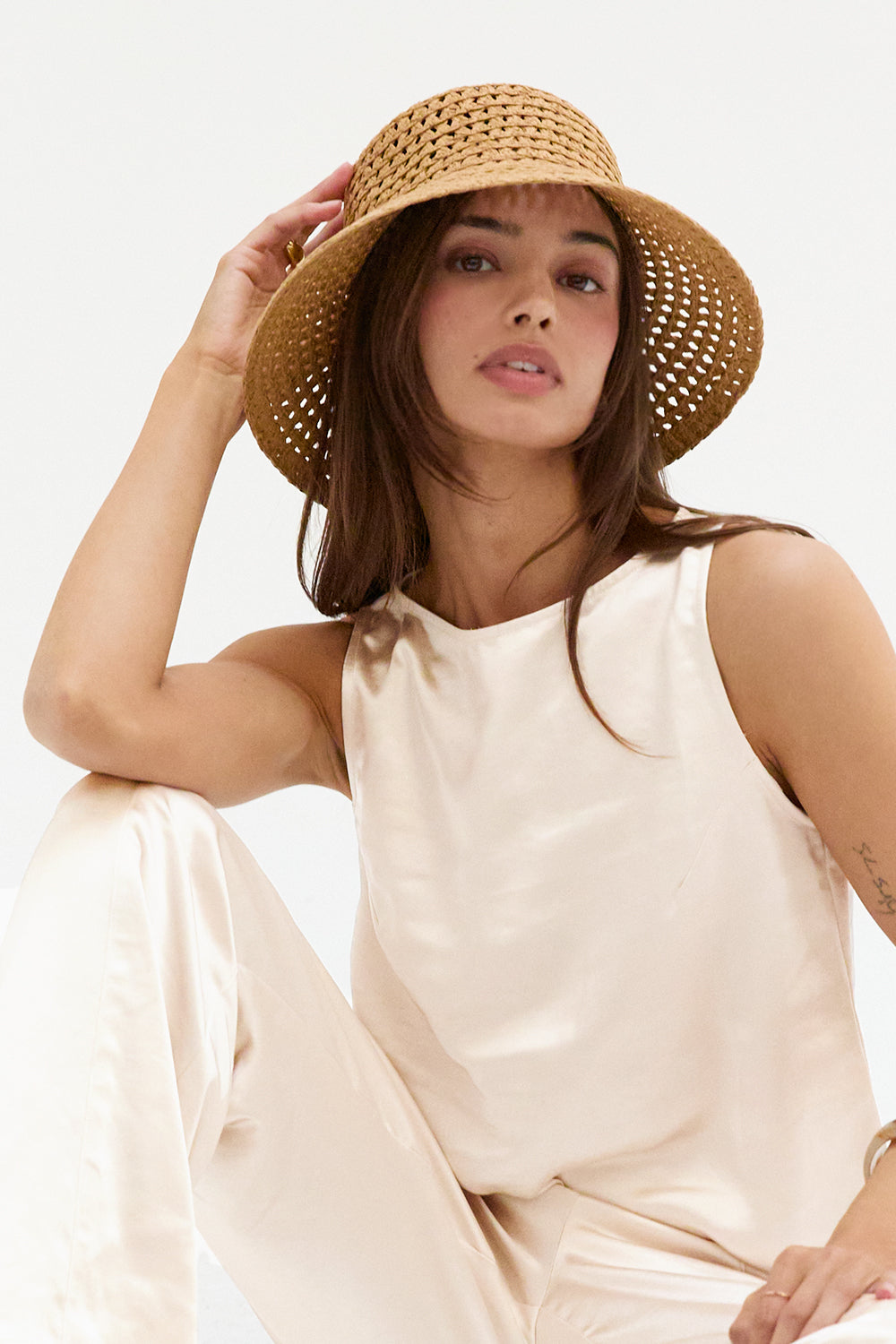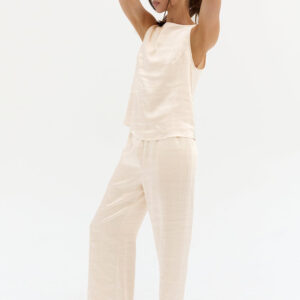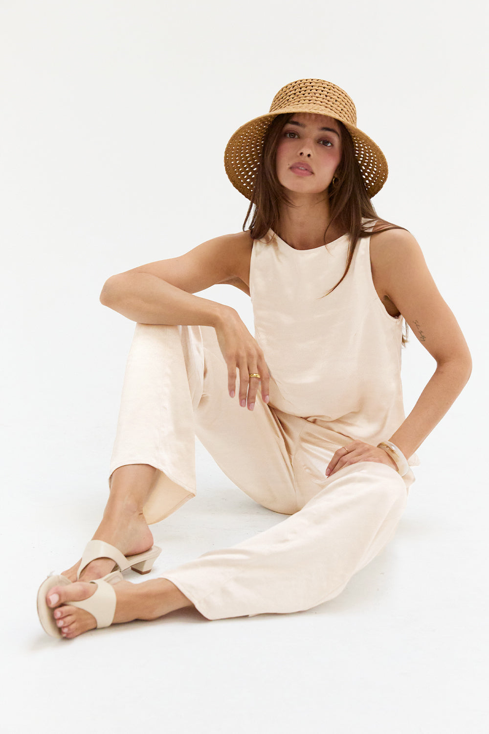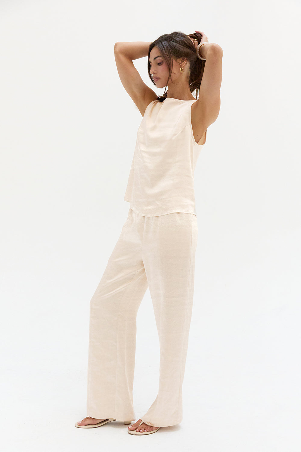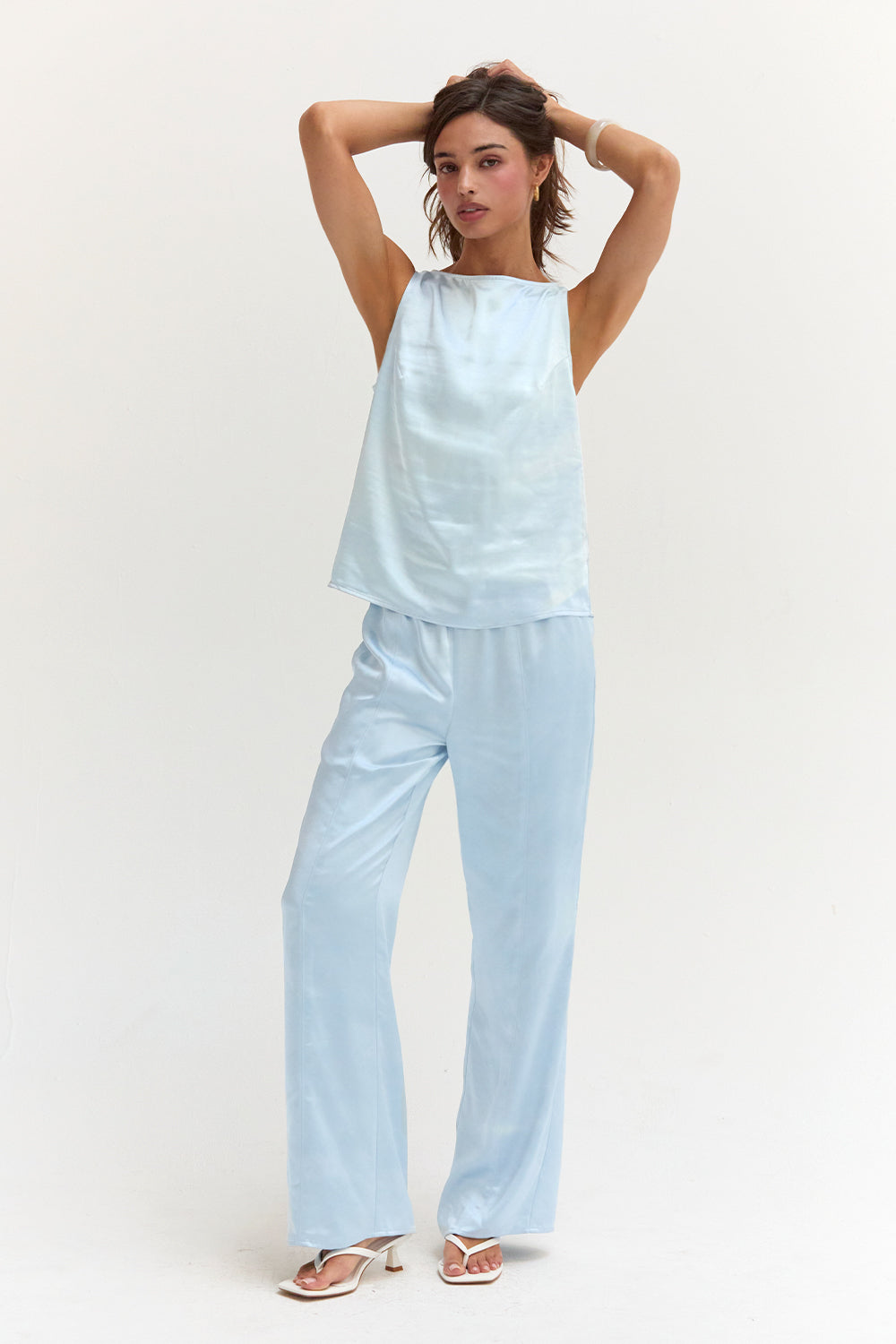 The Dawn Satin Sleeveless Top features a clean boat neckline and sleeveless silhouette in a smooth satin finish. Designed with subtle bust darts and a back keyhole, it offers a relaxed, easy fit.
