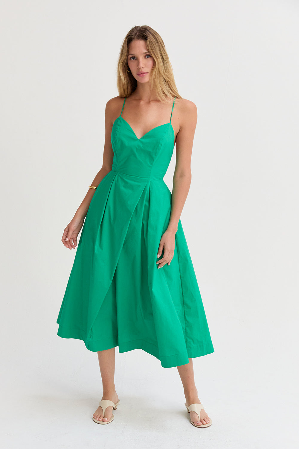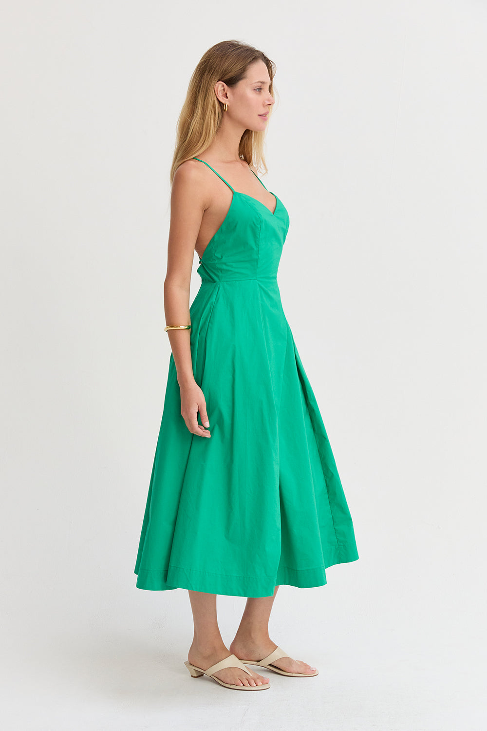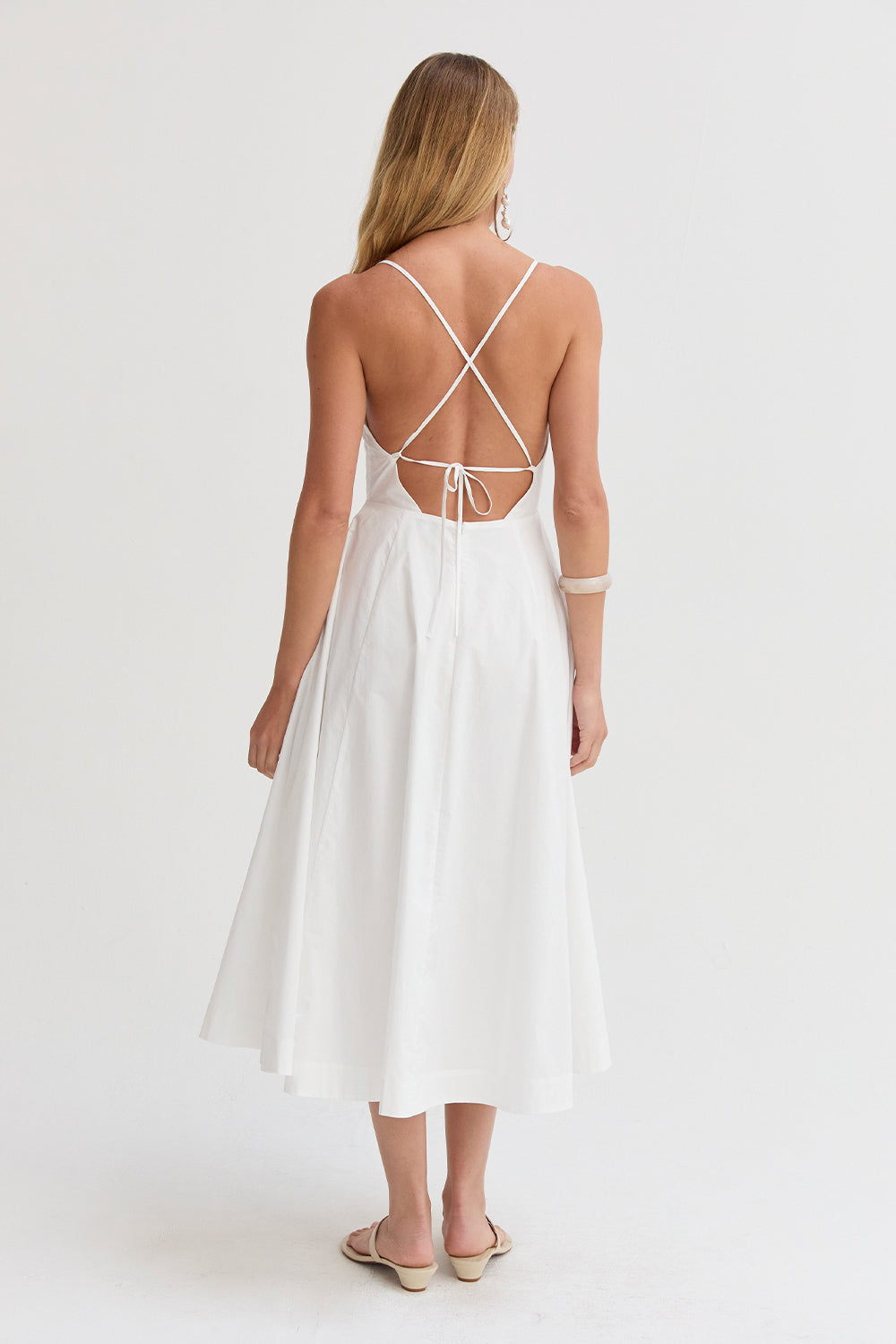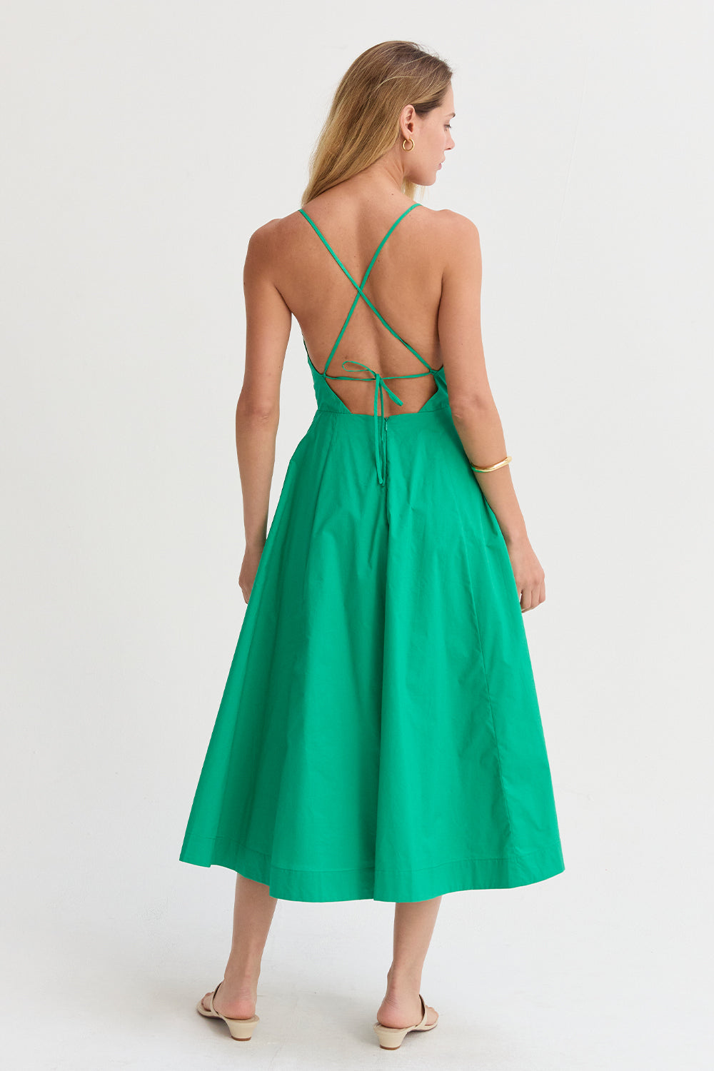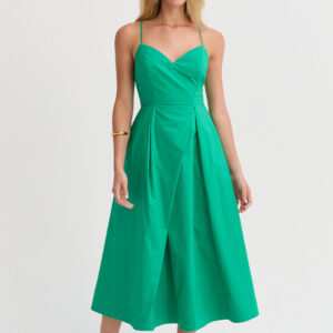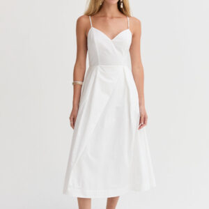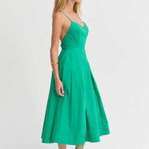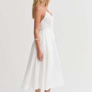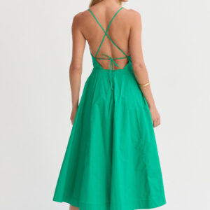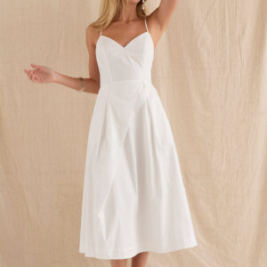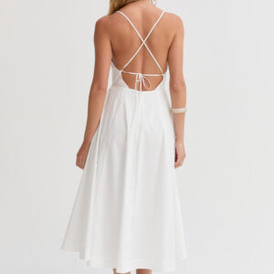 The Eunice V-neck Poplin Midi Dress is cut with a 100% cotton poplin for that crisp and clean lines. Features a V-neckline, open back with criss-cross strap fastening, side pockets, and asymmetrical pleating detail at skirt.