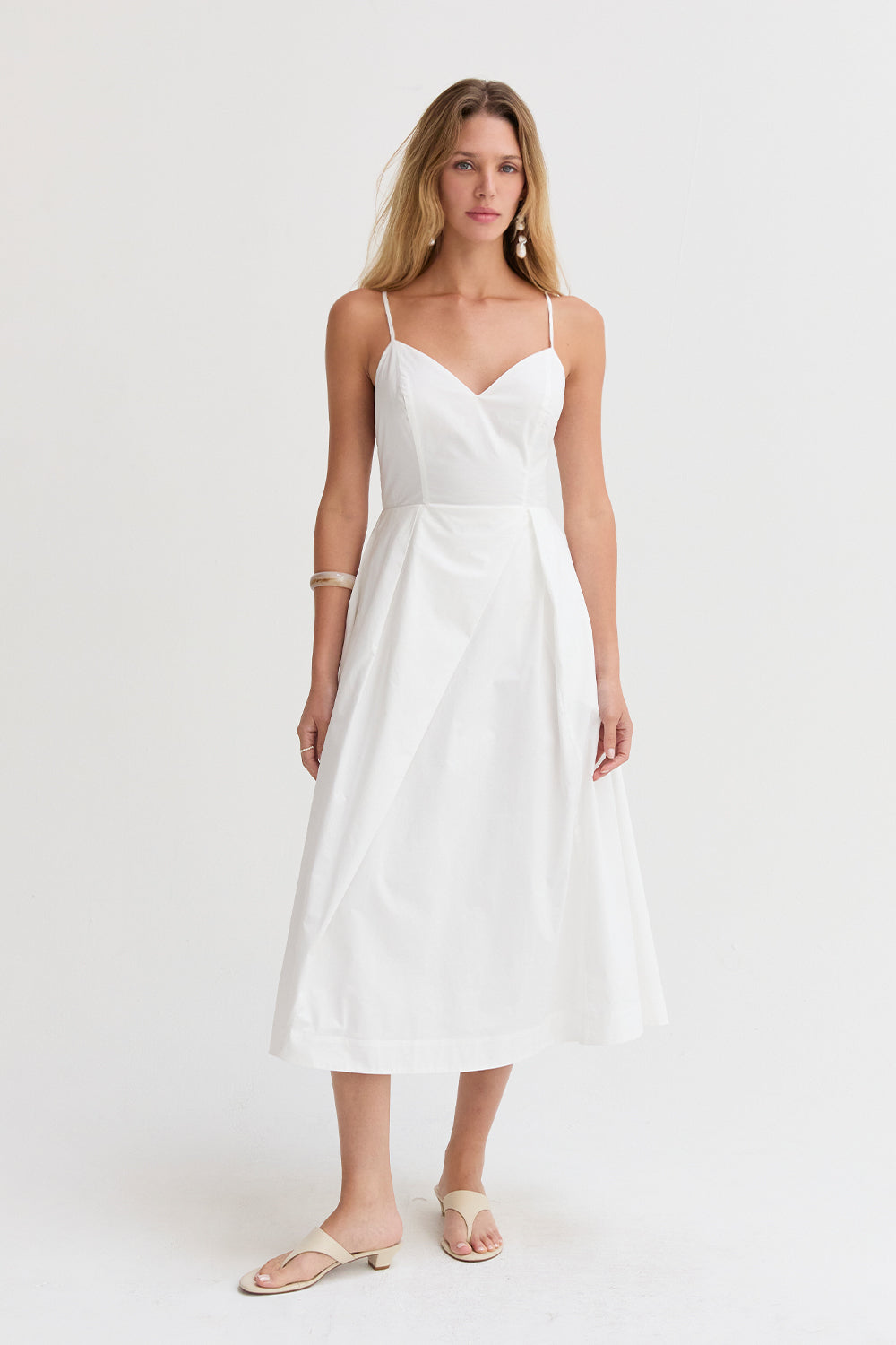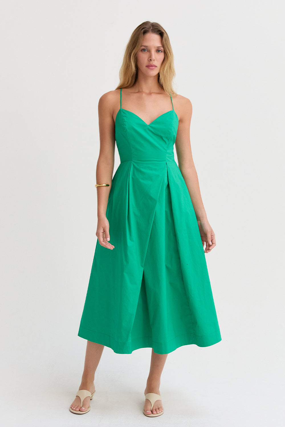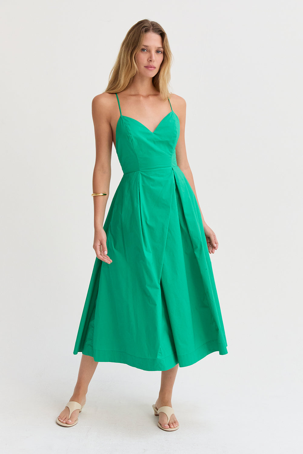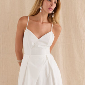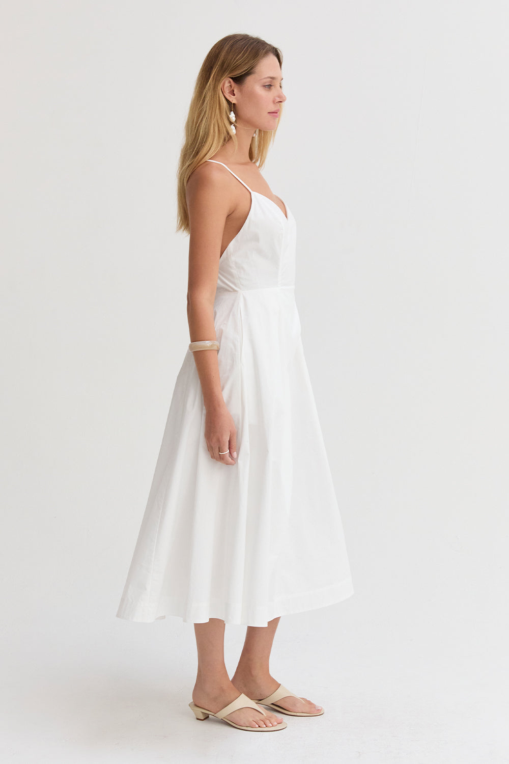 The Eunice V-neck Poplin Midi Dress is cut with a 100% cotton poplin for that crisp and clean lines. Features a V-neckline, open back with criss-cross strap fastening, side pockets, and asymmetrical pleating detail at skirt.