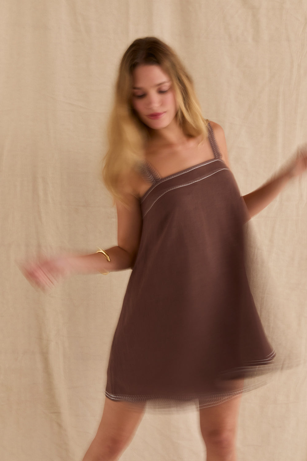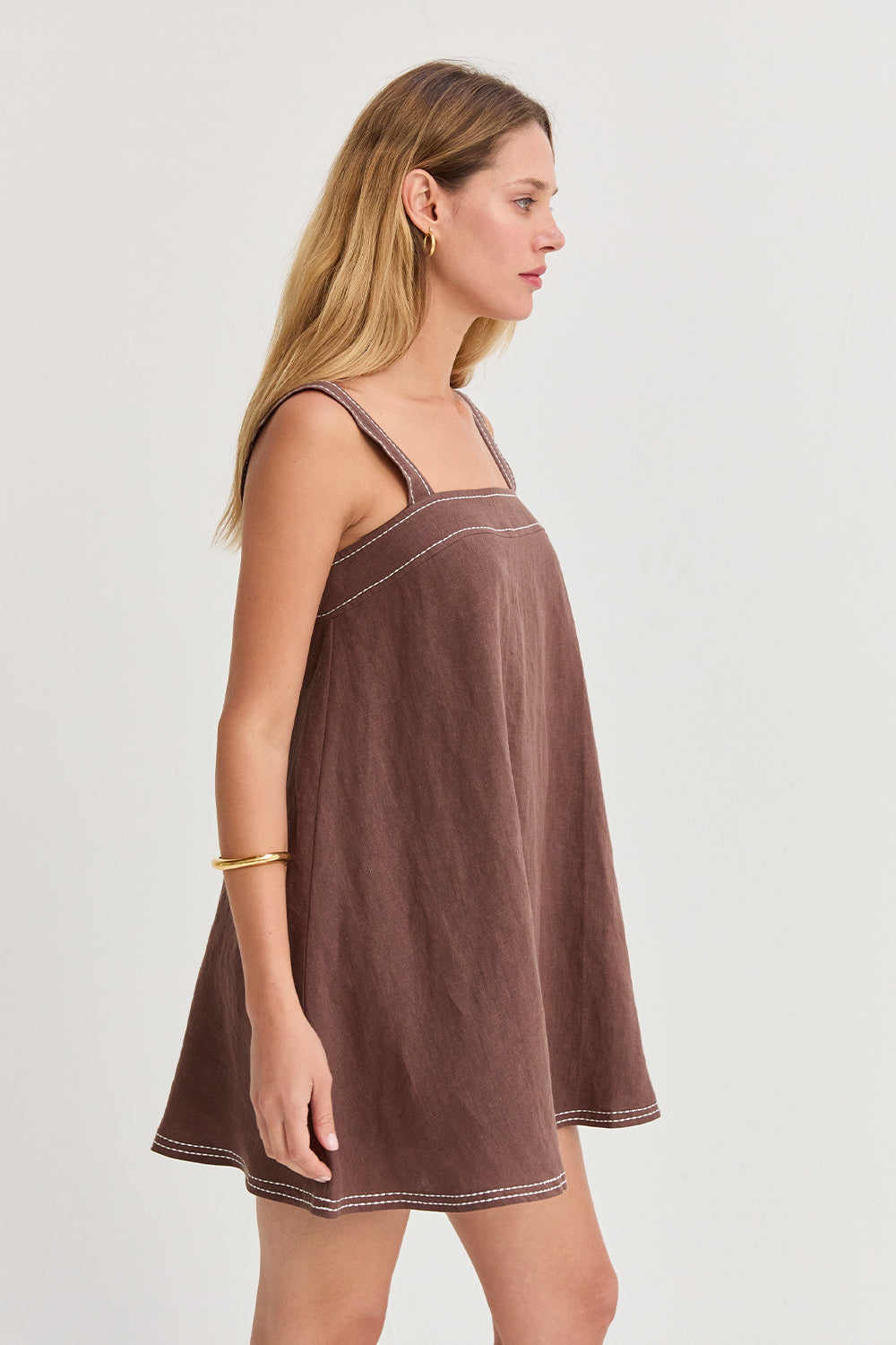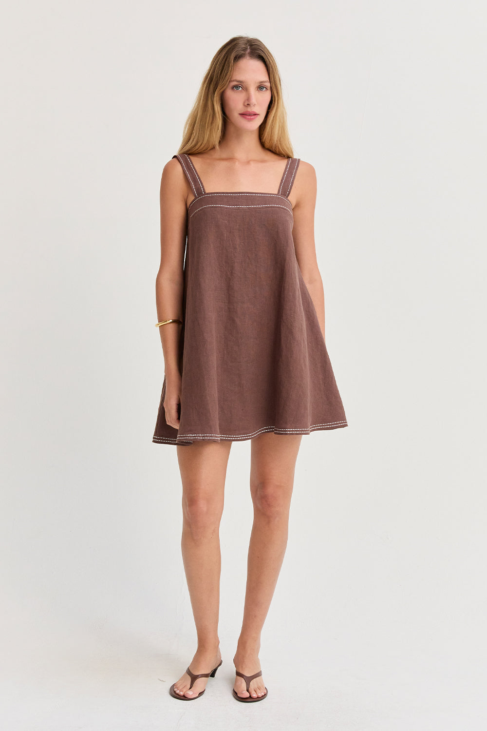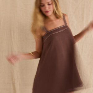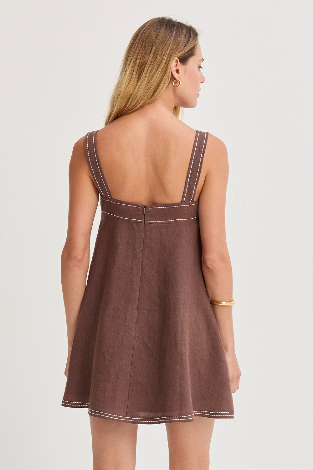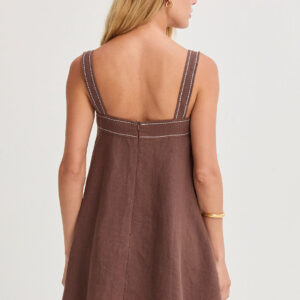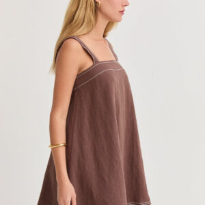The Jael Contrast Stitch Square Neck Linen Mini Dress features a clean square neckline with bra-friendly straps and a softly flared silhouette. Finished with contrast stitching and a back zipper closure, it’s fully lined for an easy, polished look.