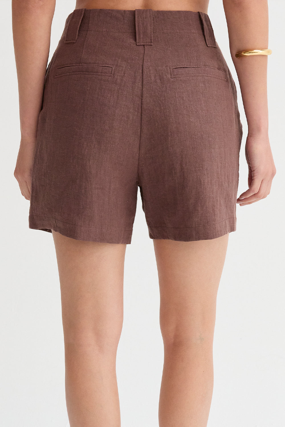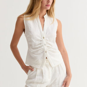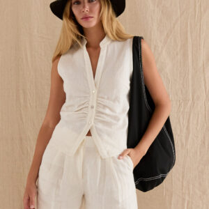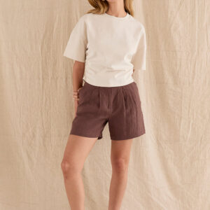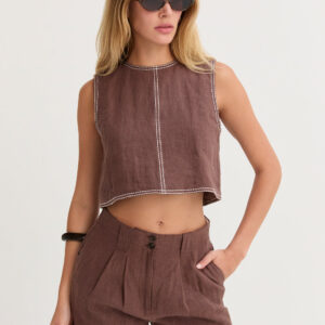 Style the shorts with the matching Jaylin Sleeveless Mandarin Collar Linen Blouse and Kiara Contrast Stitch Linen Crop Top as pictured.